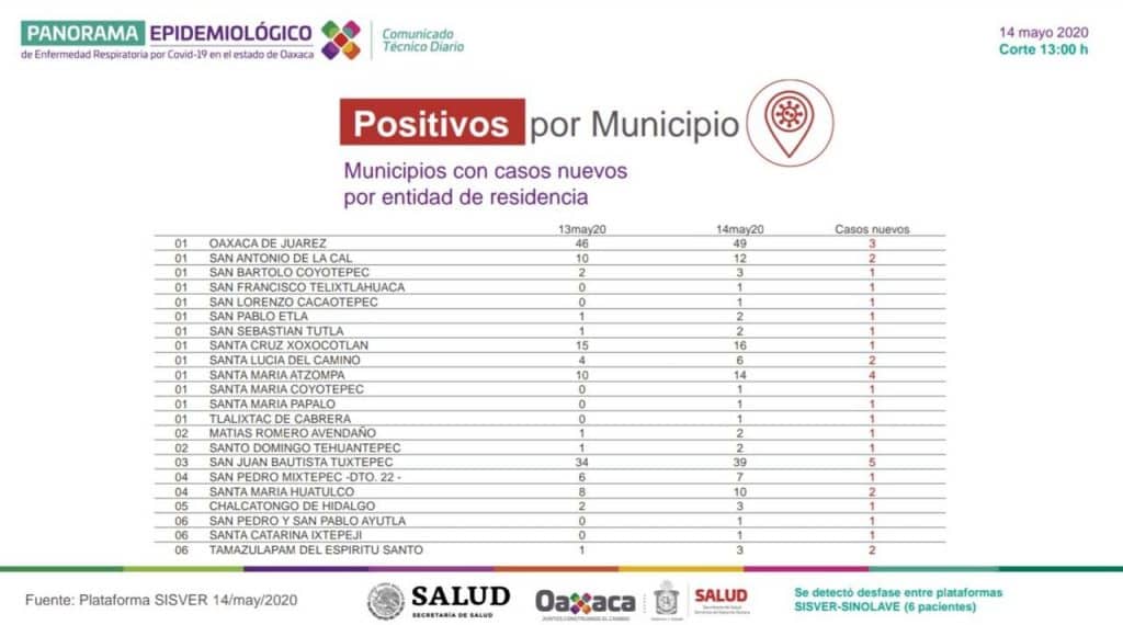 En Oaxaca al corte del día de hoy 14 de mayo, se tiene un aumento de 35 NUEVOS casos, se contabilizan en total 326 casos confirmados a COVID-19, 183 en espera de resultados por laboratorio y desafortunadamente se suman 4 muertes más dando un total de 59 decesos por este virus.