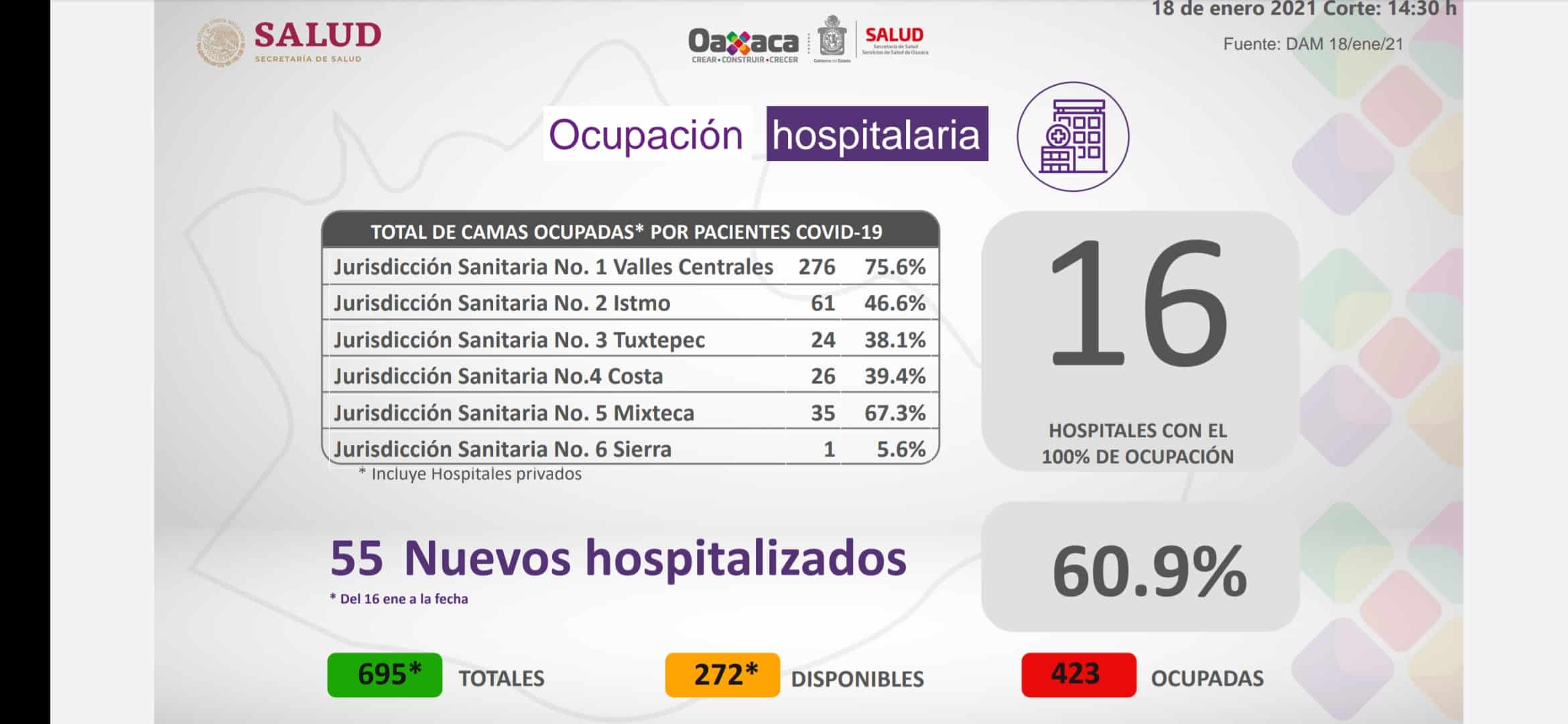 🟥 Aunque los Servicios de Salud de Oaxaca sólo reportaron 90 casos de Covid y 2 fallecimientos este lunes, se sumaron 61 personas hospitalizadas durante el fin de semana y ahora son 423 internados en hospitales