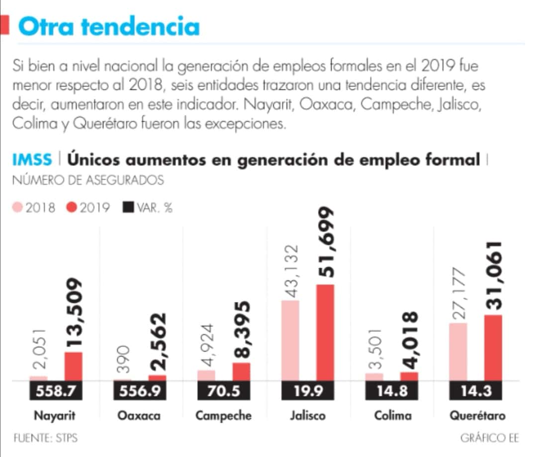 Únicamente en el 2019, los cinco mayores generadores de trabajos formales fueron la Ciudad de México (59,207 asegurados), Jalisco (51,699), Querétaro (31,061), Nuevo León (24,701) y Guanajuato (19,700).
