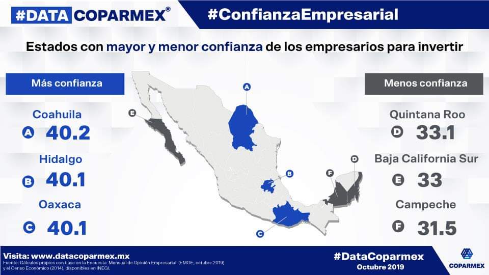 Así, el estado con mayor confianza para invertir es Coahuila, con 40.2 por ciento; le siguen Hidalgo con 40.1 y Oaxaca con 40.1; además, los estados con menor confianza son Quintana Roo con 33.1, Baja California Sur con 33 y Campeche con 31.1 por ciento.