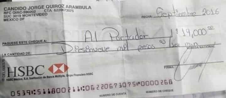 Sobre cheques al portador, los estafadores refieren a sus posibles víctimas que no cuentan con la credencial del Instituto Nacional Electoral, por lo que piden que se los cambien pero que en garantía le dejen cierta cantidad de dinero, sin embargo, en caja los incautos se percatan que el cheque no tiene fondos o es falso.