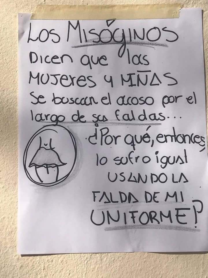 En los carteles colocados dentro del mismo plantel, los alumnos denuncian acoso, violencia de genero, hostigamiento y actitudes misóginas, presuntamente realizadas por un maestro, quien es coloquialmente conocido por el sobre nombre de “Pinky”.
