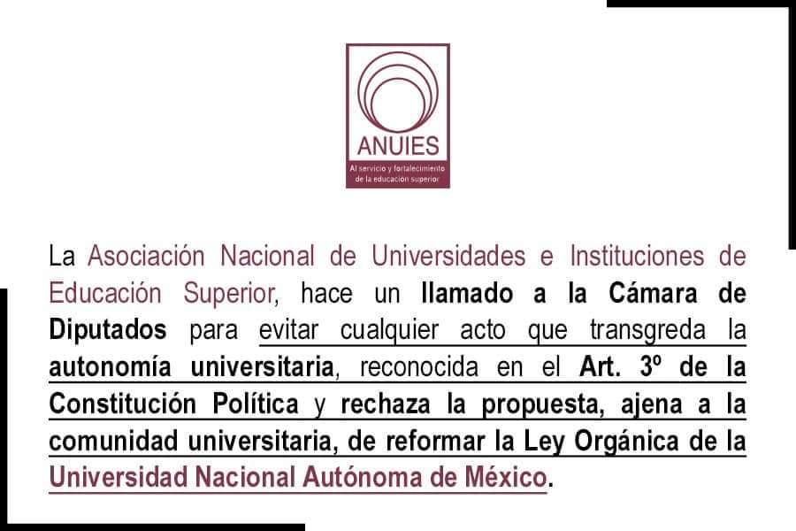La Asociación Nacional de Universidades e Instituciones de Educación Superior, hace llamado a la Cámara de Diputados del Congreso de la Unión para evitar cualquier acto que transgreda la Autonomía Universitaria, reconocida en el Artículo 3o de la Constitución Política y rechaza la propuesta ajena a la Comunidad Universitaria, de reformar la Ley Orgánica de la Universidad Nacional Autónoma de México.