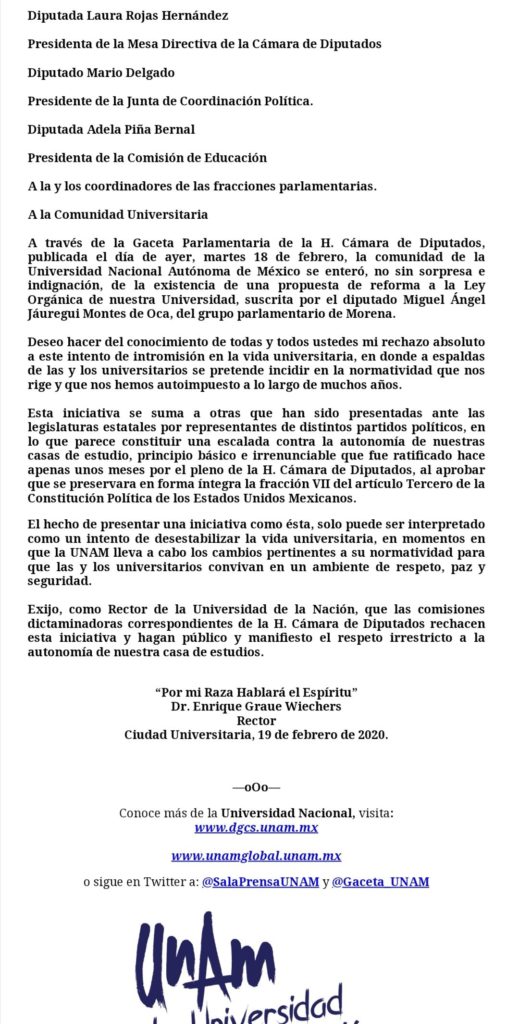 En una carta enviada por él Dr. Enrique Graue Wiechers, Rector de la Universidad Nacional Autónoma de México a la Comunidad Universitaria y a la Cámara de Diputados del Congreso de la Unión