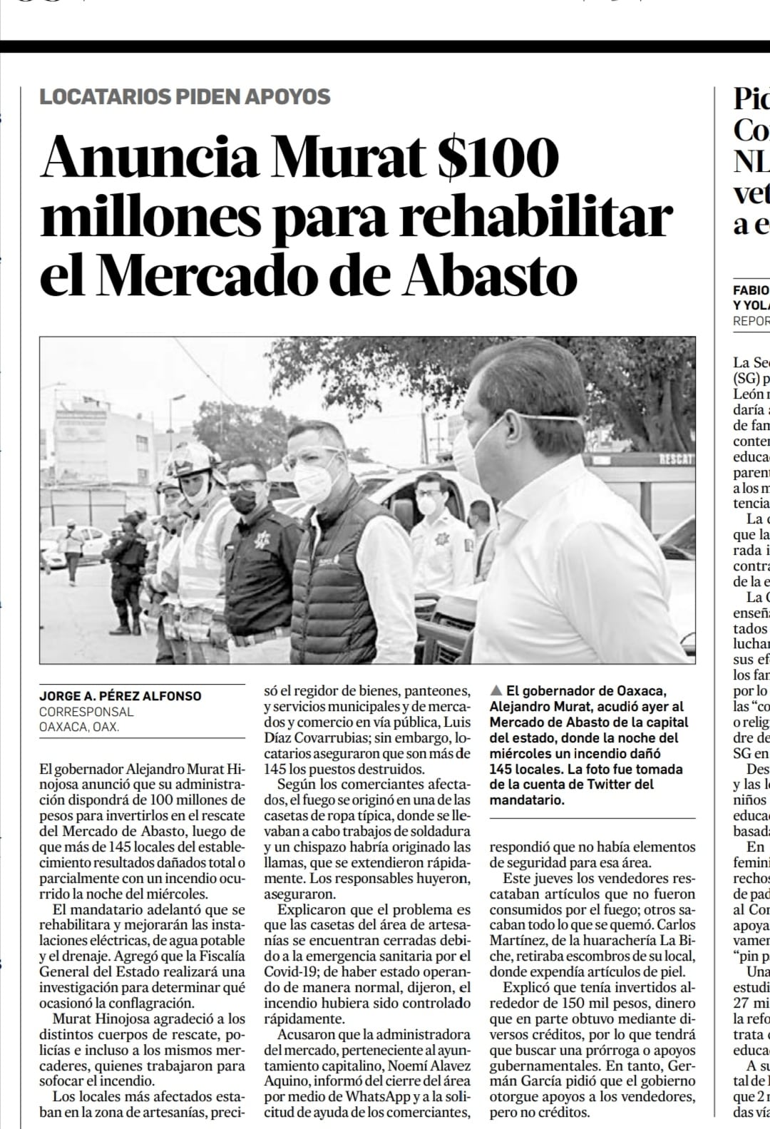 En este sentido, el Mandatario Estatal reconoció y agradeció el trabajo realizado por elementos del Heroico Cuerpo de Bomberos, de Seguridad Pública de Oaxaca, de Protección Civil, de la Secretaría de la Defensa Nacional, de los Servicios de Agua Potable y Alcantarillado, así como de las y los locatarios, quienes sumaron esfuerzos para controlar el fuego.