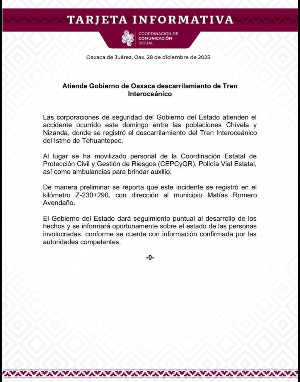 Las corporaciones de seguridad del Gobierno del Estado atienden el accidente ocurrido este domingo entre las poblaciones Chívela y Nizanda, donde se registró el descarrilamiento del Tren Interoceánico del Istmo de Tehuantepec.
