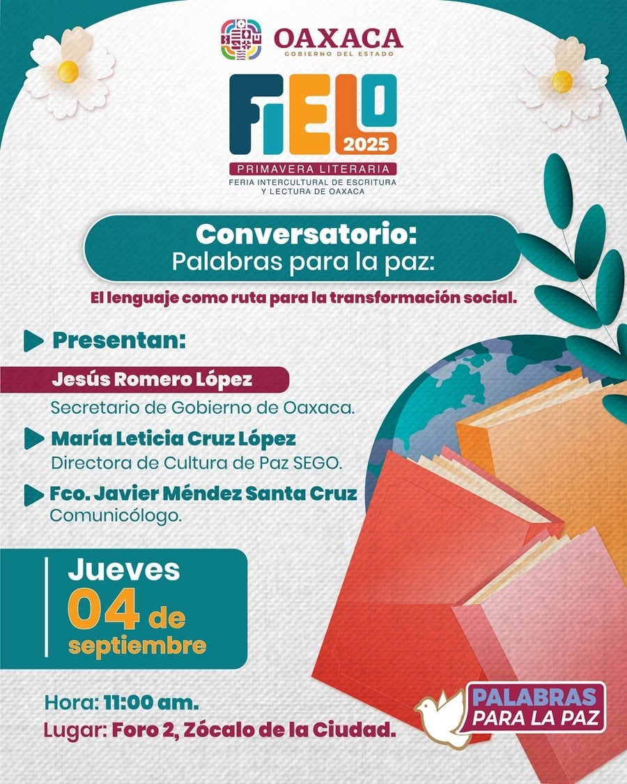 Oaxaca de Juárez, Oax. 2 de septiembre de 2025.- Para promover el lenguaje como una fuerza constructora de realidades, identidades y vínculos sociales, la Secretaría de Gobierno (Sego) presentará su programa “Palabras para la paz” en la Feria Intercultural de Escritura y Lectura de Oaxaca (FIELO) 2025.