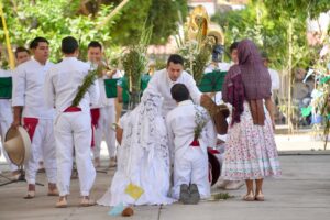 El fandango, que comienza con la pedida de mano y la preparación de la boda, es más que un acto social, es un símbolo de unión, cariño y prosperidad. En la ceremonia, las familias intercambian flores blancas, velas, cohetones, nieve y dulces regionales, marcando el inicio de una celebración que une corazones y fortalece las raíces de la comunidad.
