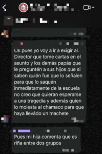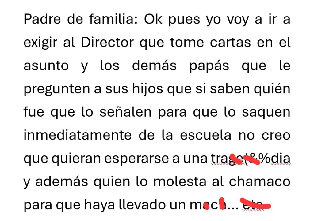 Lo más alarmante es que estos hechos los hemos conocido únicamente por lo que comentan los propios estudiantes y por las conversaciones entre madres y padres en grupos de WhatsApp, ya que la escuela no ha informado de manera clara, oportuna ni transparente a las familias. Esta omisión nos impide tomar medidas preventivas adecuadas y genera una profunda incertidumbre sobre la seguridad escolar.
