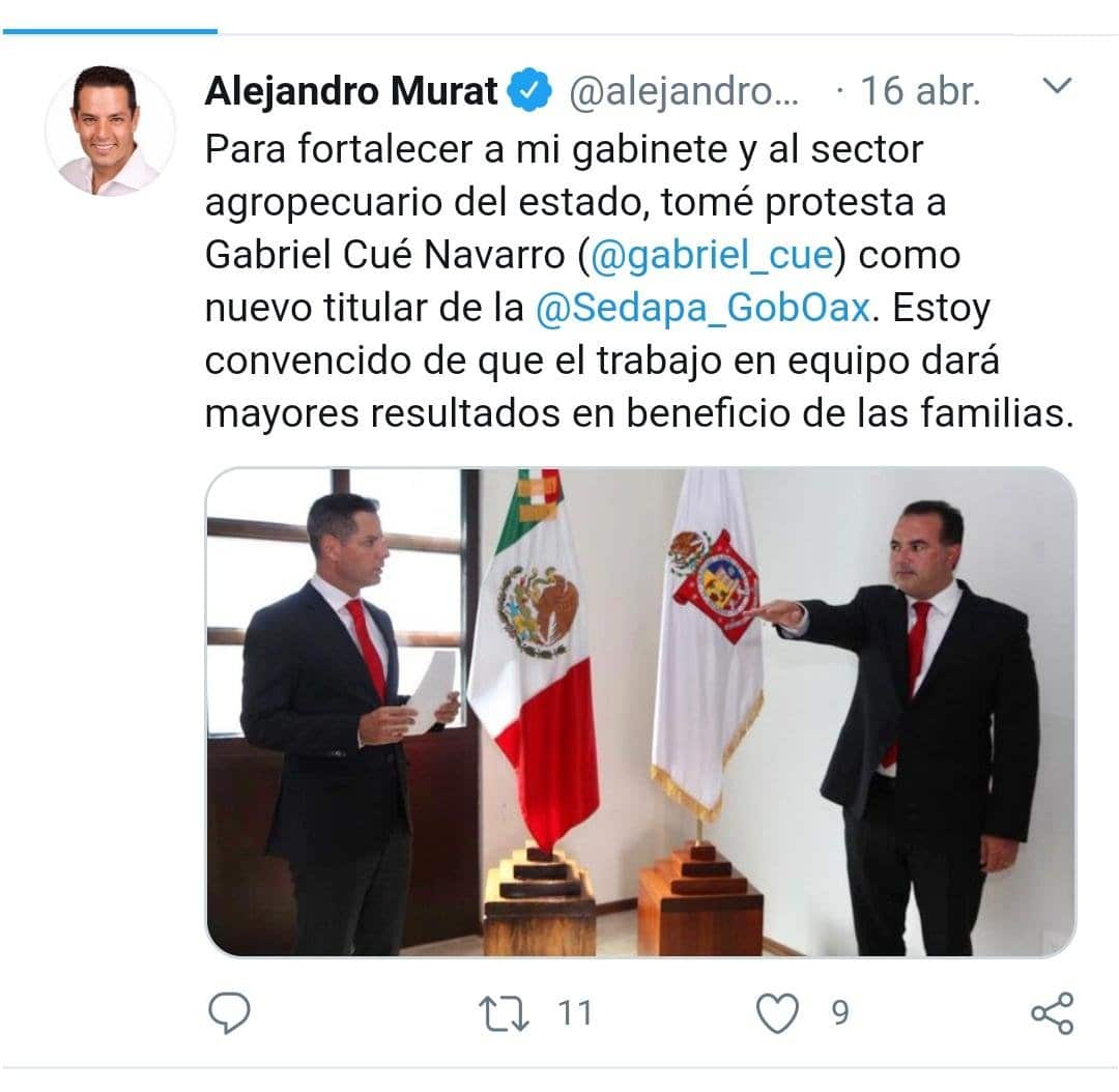 Oaxaca de Juárez, Oax. 16 de abril de 2020. Como parte de las acciones para fortalecer las tareas gubernamentales a favor de las y los oaxaqueños, el gobernador Alejandro Murat Hinojosa realizó la toma de protesta de ley a Gabriel Cué Navarro, como nuevo titular de la Secretaría de Desarrollo Agropecuario, Pesca y Acuacultura (Sedapa).