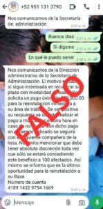 Asimismo, llama a no dejarse sorprender por publicaciones fraudulentas que circulan a través de redes sociales y/o plataformas con relación a la revocación de plazas de nombramiento confianza.