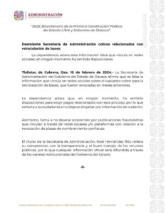 Tlalixtac de Cabrera, Oax. 10 de febrero de 2024.- La Secretaría de Administración del Gobierno del Estado de Oaxaca afirma que es falsa la información que circula en redes sociales sobre el supuesto cobro para la reinstalación de bases, que fueron revocadas en meses anteriores.