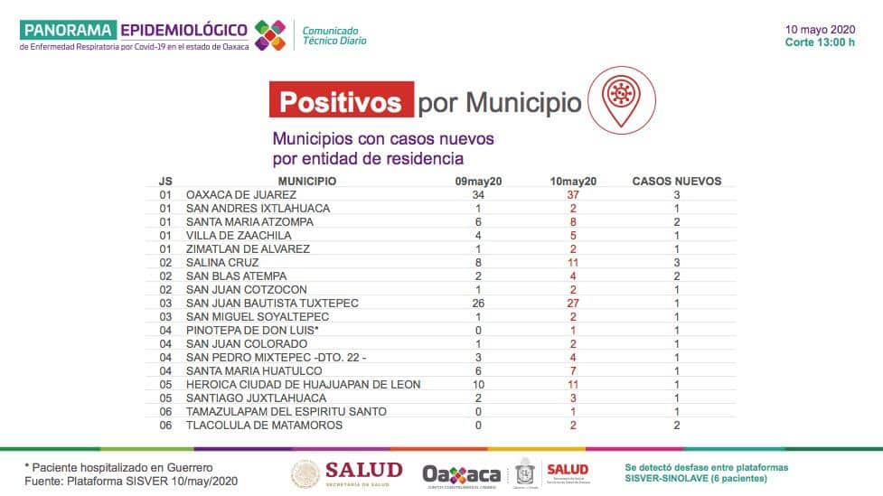 Distribución por municipios de los 25 nuevos casos positivos de COVID19 el día de hoy en Oaxaca. admin 10 mayo 2020 Post navigation Anterior Casos Covid-19 #AlmomentoSiguiente En el Día de las Madres se reportan 6 fallecimientos y 25 casos nuevos de Covid-19. Historias relacionadas Abre Salomón Jara Farmacia Bienestar en Santiago Juxtlahuaca que dará atención médica gratuita a más de 10 mil personas Abre Salomón Jara Farmacia Bienestar en Santiago Juxtlahuaca que dará atención médica gratuita a más de 10 mil personas 16 agosto 2025 IMSS-BIENESTAR RESTABLECE SERVICIOS MÉDICOS EN LA COSTA OAXAQUEÑA, TRAS EL IMPACTO DEL HURACÁN ERICK. IMSS-BIENESTAR RESTABLECE SERVICIOS MÉDICOS EN LA COSTA OAXAQUEÑA, TRAS EL IMPACTO DEL HURACÁN ERICK. 25 junio 2025 Resguarda DIF Oaxaca a familia de Zaachila para restituir derechos de tres menores de edad Resguarda DIF Oaxaca a familia de Zaachila para restituir derechos de tres menores de edad 24 mayo 2025