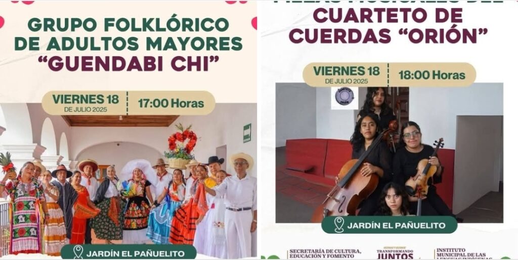 Este viernes 18 de julio inicia la cartelera artística con tres eventos imperdibles, a las 17:00 horas se presentará el grupo folklórico de adultos mayores “Guendabi Chi”. Una muestra de orgullo y preservación de nuestras raíces a través del talento de quienes mantienen viva la herencia cultural oaxaqueña.