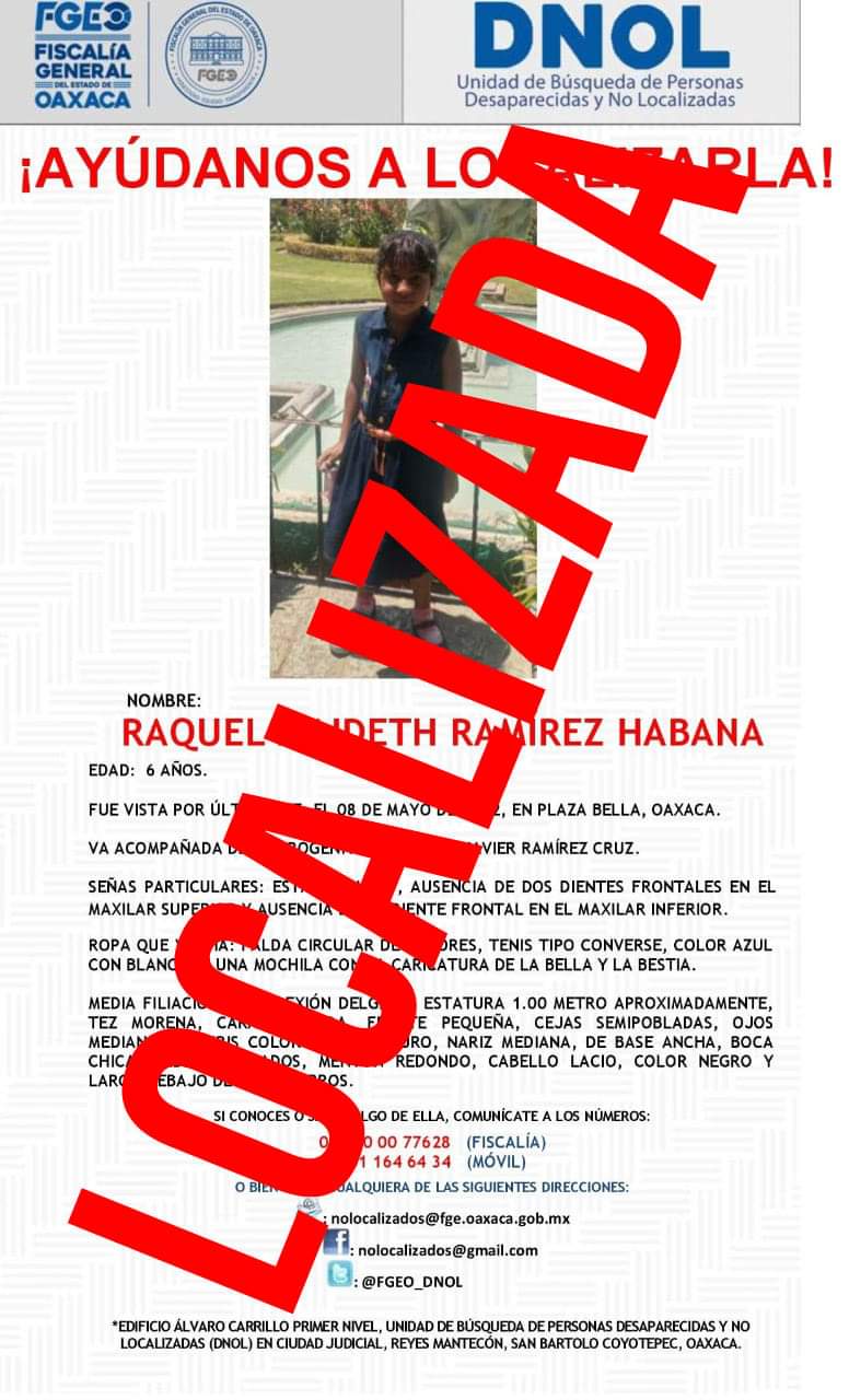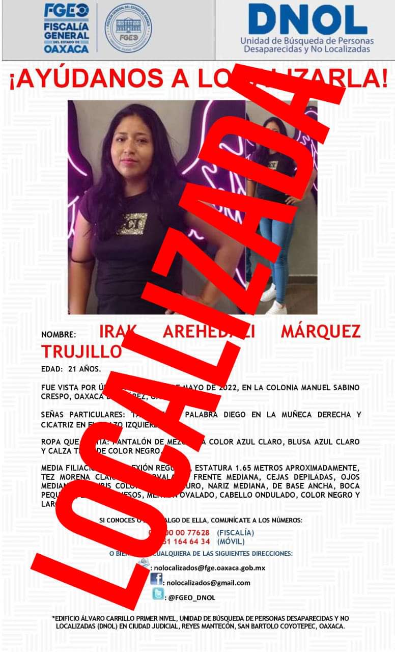 A su vez, se dio con el paradero de las ciudadanas Aranza Juárez Reyes, reportada como No Localizada en marzo del año en curso en Lomas de San Javier, Santa Cruz Xoxocotlán y de Irak Arehedaly Márquez Trujillo, con reporte de no localización vigente desde el 7 de mayo pasado, cuando fue vista por última vez en la colonia Manuel Sabino Crespo de Oaxaca de Juárez.