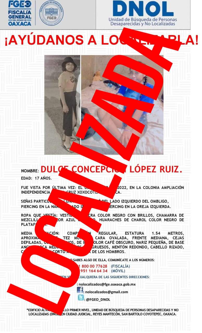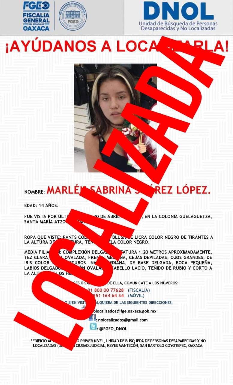 a las adolescentes Marlene Sabrina Juárez López, quien fue vista por última vez el 30 de abril del año en curso en inmediaciones de la colonia Guelaguetza de Santa María Atzompa y a Dulce Concepción López Ruiz, vista por última vez en la colonia Ampliación Independencia de Santa Cruz