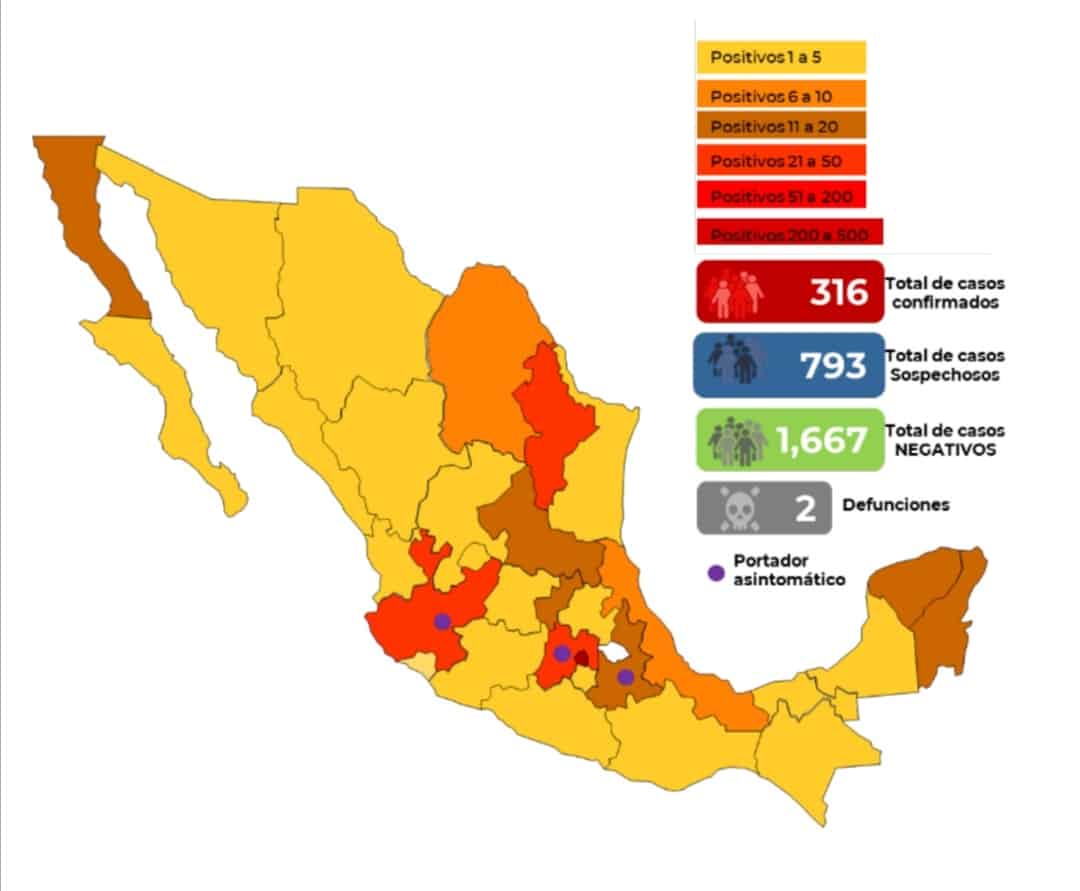 • En México hasta el día de hoy se han confirmado 316 casos y dos defunciones por