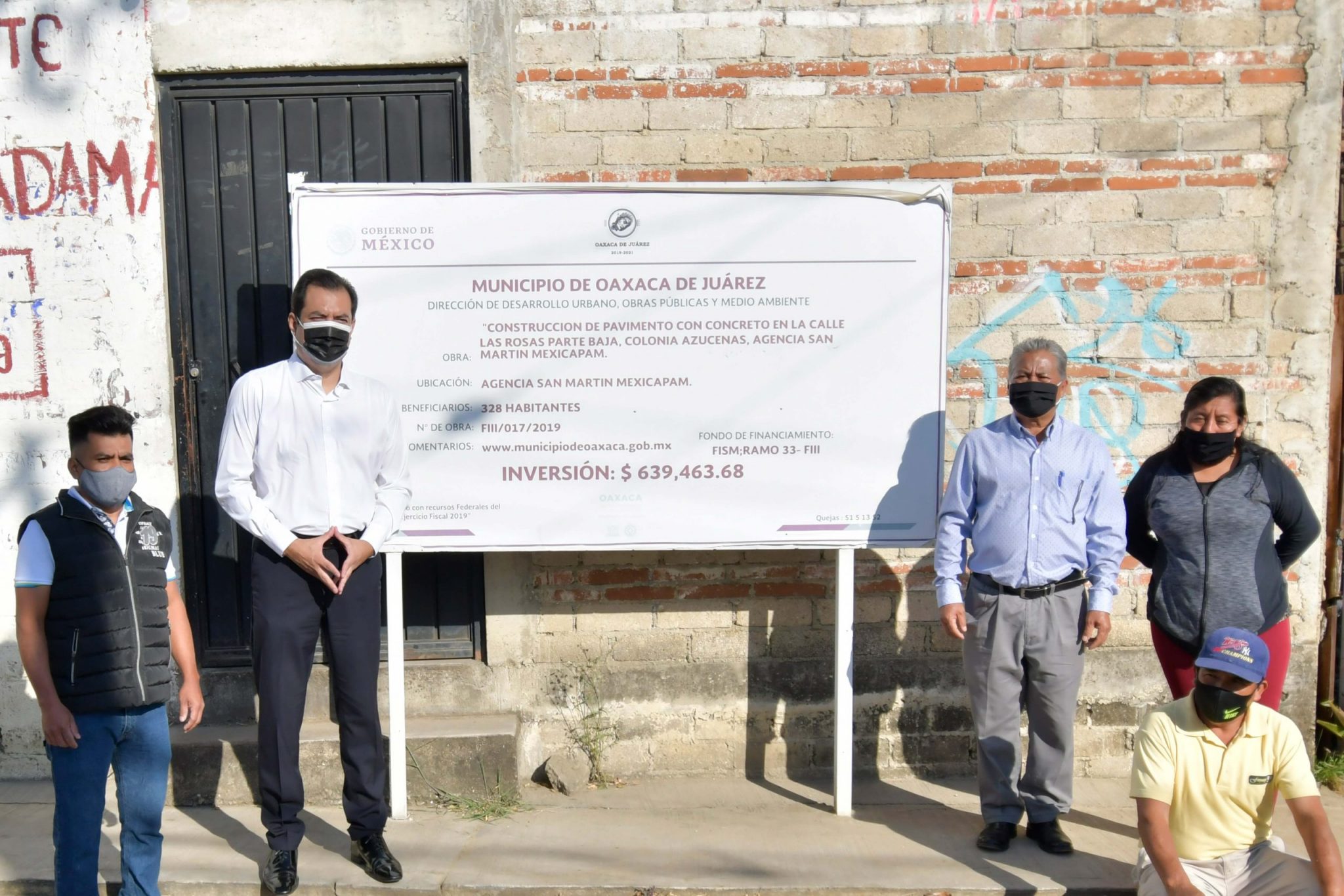 Oaxaca de Juárez, Oaxaca, a 12 de noviembre de 2020.- Con la aplicación transparente de 639,463.68 pesos de los recursos provenientes del Fondo de Aportaciones para la Infraestructura Social (FAIS), el Presidente Municipal de Oaxaca de Juárez, Oswaldo García Jarquín, entregó a las y los habitantes de la colonia Azucenas, en la agencia municipal de San Martín Mexicapam, la construcción de pavimento con concreto hidráulico en la calle Las Rosas, parte baja.