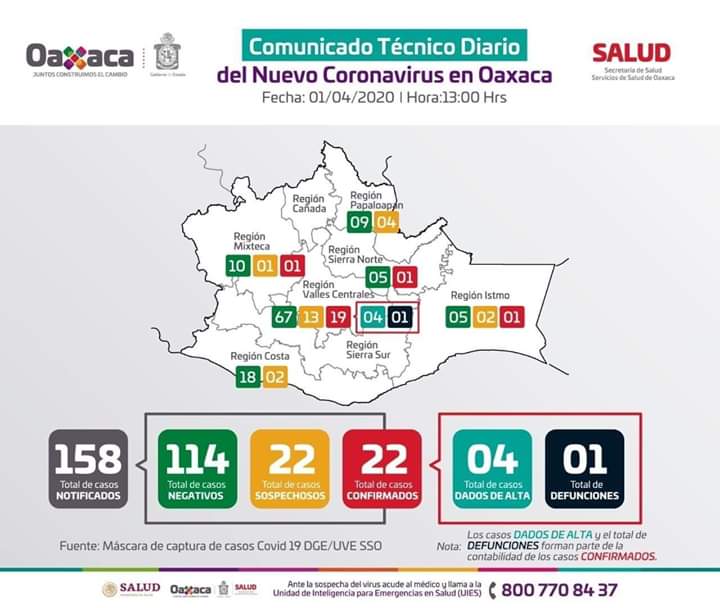 Al corte del 1 de abril del presente año, suman 158 notificaciones: 10 más en comparación del día martes, de este global, se han descartado 114 casos, se tienen en estudio 22 sospechosos, y se han dado de alta médica a cuatro oaxaqueños que dieron positivo a la enfermedad, al cumplir los 14 días de aislamiento social.