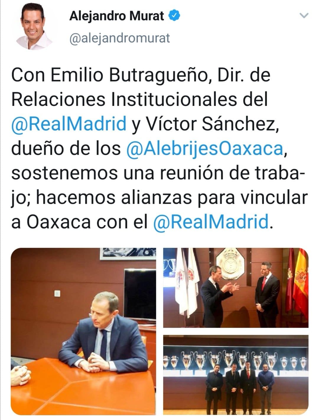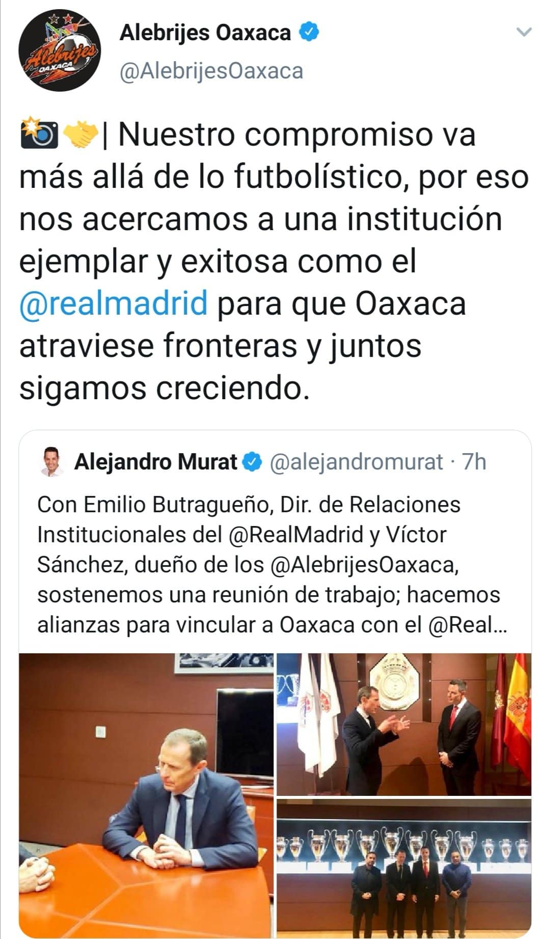 Por su parte Alebrijes: «Nuestro compromiso va más allá de lo futbolístico, por eso nos acercamos junto al gobernador Alejandro Murat Hinojosa a una institución ejemplar y exitosa como el Real Madrid C.F. para que Oaxaca atraviese fronteras y juntos sigamos creciendo», publicó Alebrijes en su página oficial.