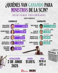 Ciudad de México, 2 de junio de 2025 — En un hecho sin precedentes para el país, el abogado oaxaqueño e indígena Hugo Aguilar Ortiz se perfila como el próximo presidente de la Suprema Corte de Justicia de la Nación (SCJN), tras registrar el 59% de los votos computados hasta las 9:50 de la mañana de este lunes.
