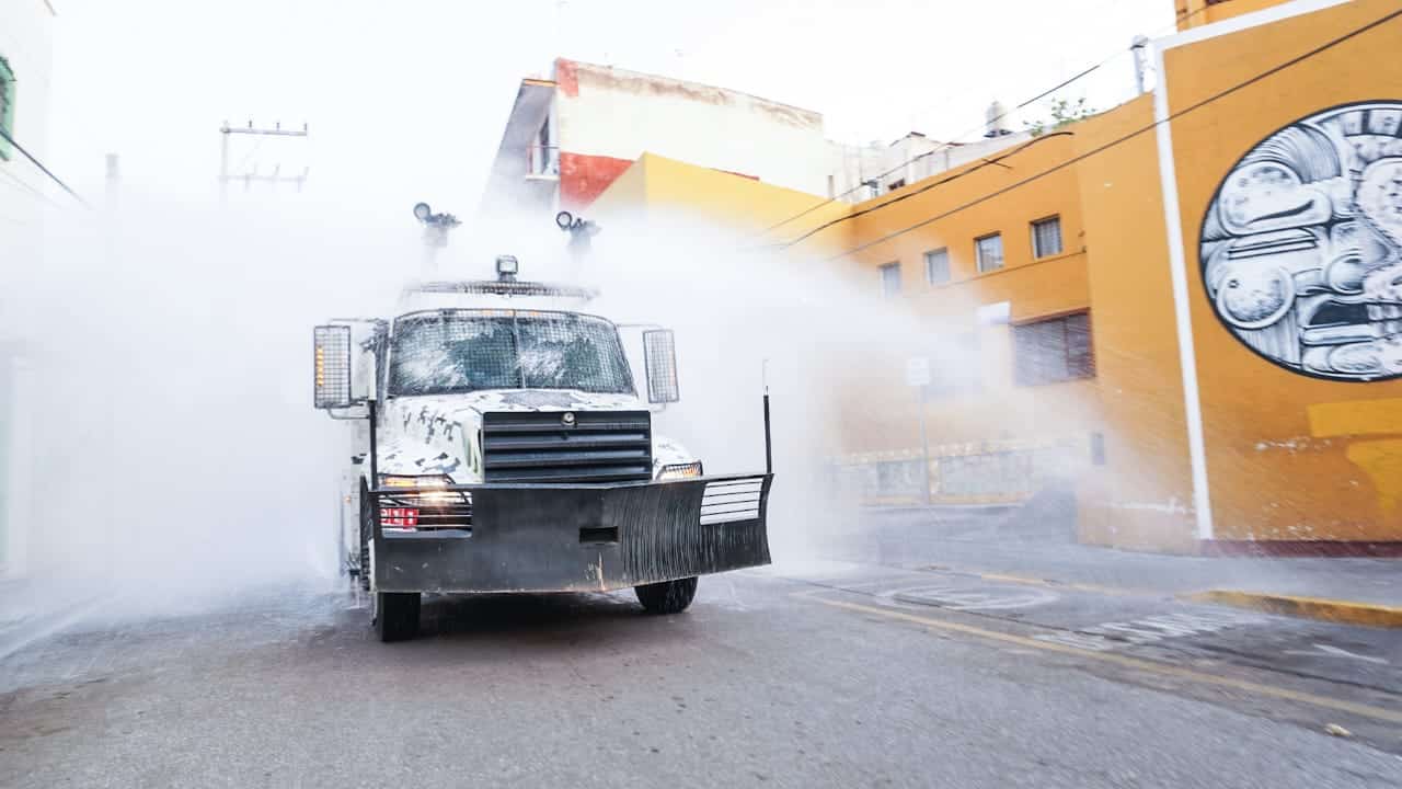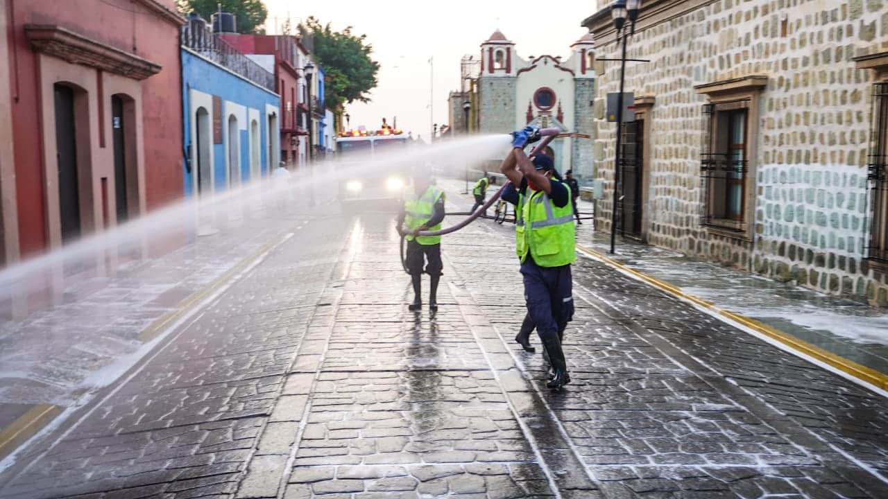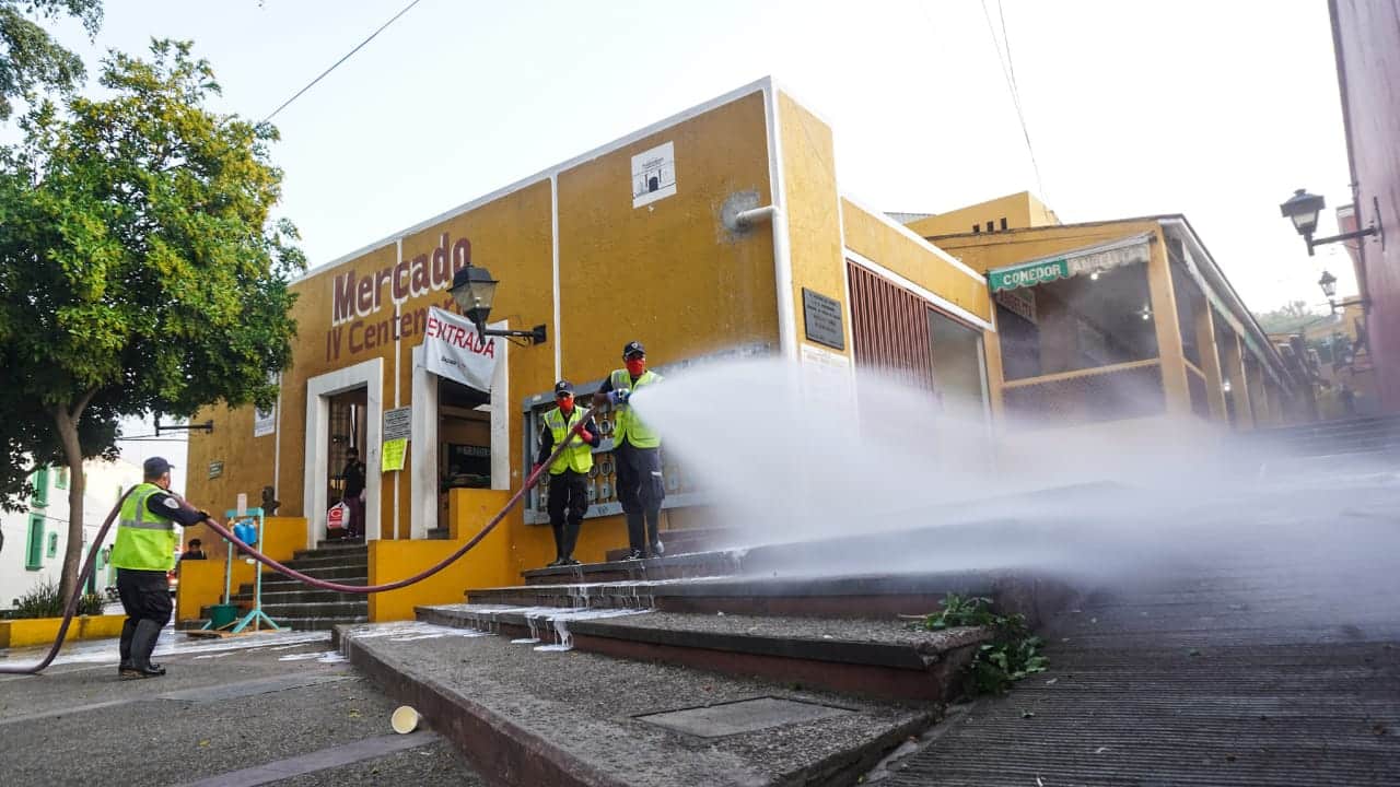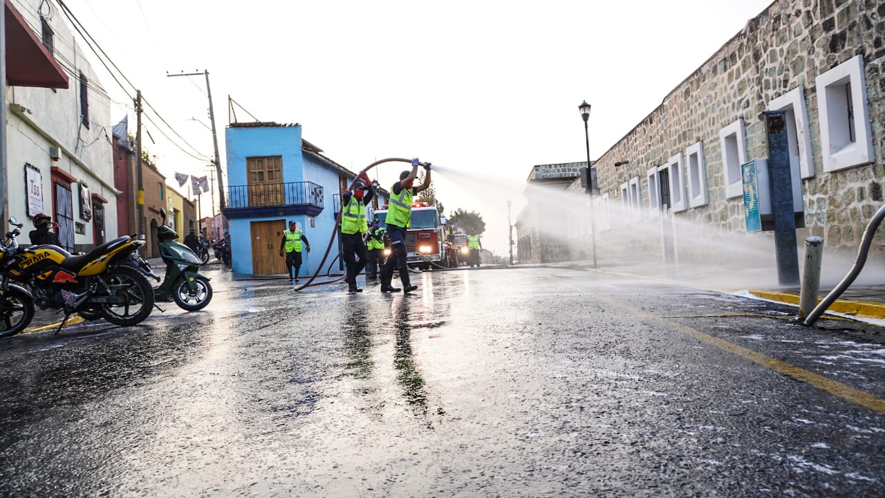 Desde muy temprana hora inicio la sanitizacion y limpieza de la calle Morelos y de el mercado Cuarto Centenario en el municipio de Oaxaca de Juárez con el invaluable apoyo del Cuerpo de Bomberos.