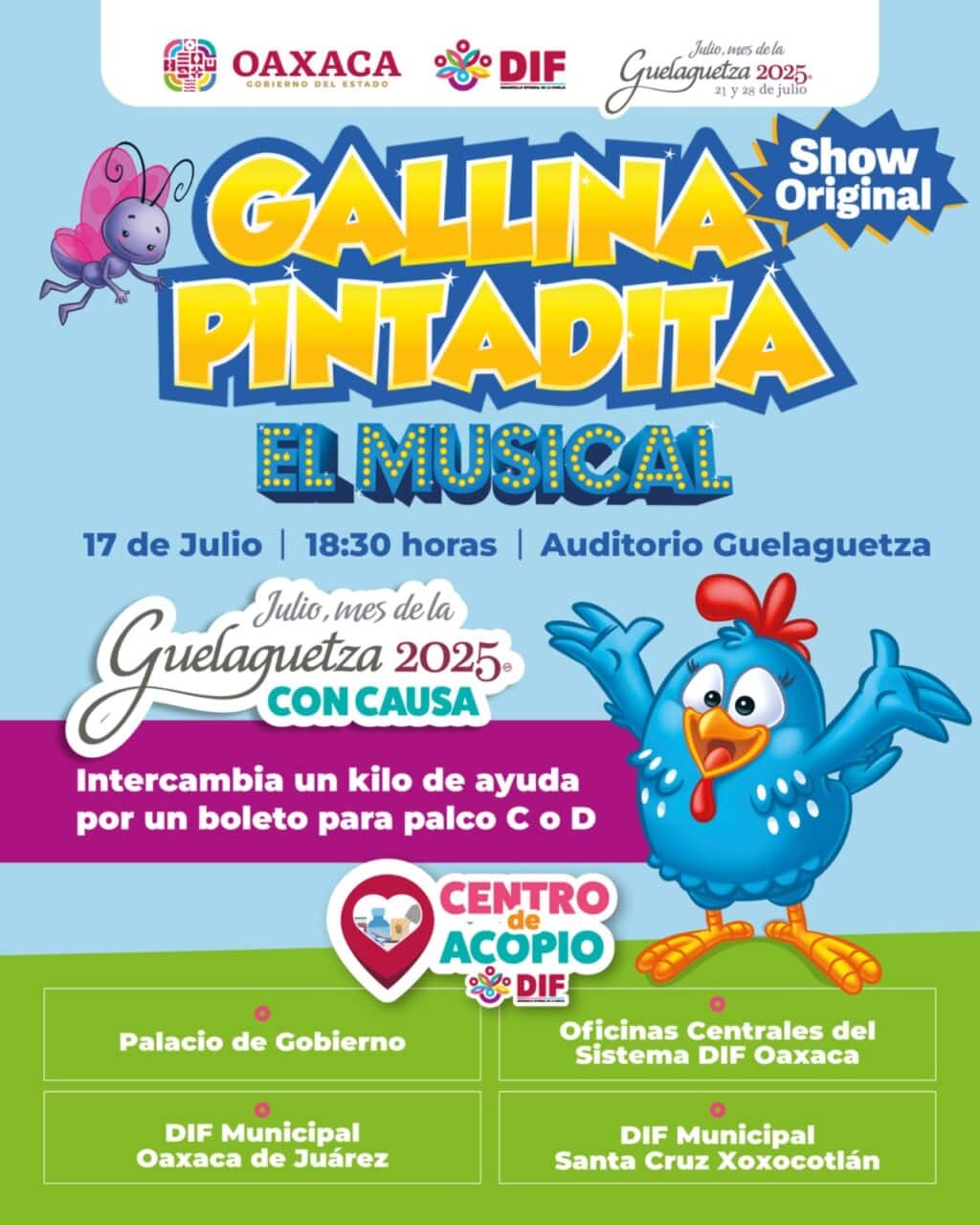 Oaxaca de Juárez, Oax. 7 de julio de 2025.- Se acerca el musical infantil “Gallina Pintadita” a llevarse a cabo el 17 de julio a las 18:30 horas en el Auditorio Guelaguetza y los accesos para los palcos C y D ya están disponibles en diversos puntos de canje instalados por el Sistema para el Desarrollo Integral de la Familia (DIF) Oaxaca.
