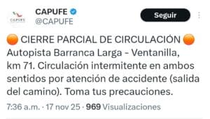 Esta madrugada de lunes 17 de noviembre de 2025, se registró un accidente vial en la autopista Barranca Larga – Ventanilla, tras el primer túnel en el tramo Puerto Escondido – Oaxaca, a la altura del paraje conocido como “Los Cuatitos”.
