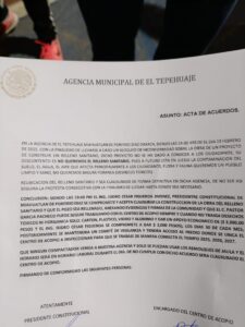 Este 13 de febrero,se firmó el convenio donde se especifica que el basurero que estaba por acondicionarse en la comunidad de Tepehuaje Miahuatlan queda suspendido.