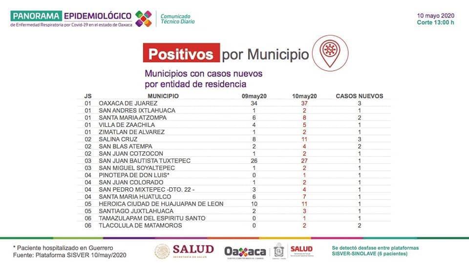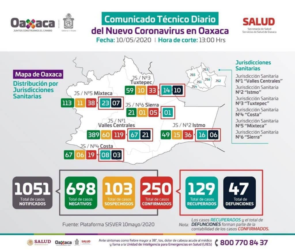 Oaxaca de Juárez, Oax. 10 de mayo de 2020.- El titular de los Servicios de Salud de Oaxaca (SSO), Donato Casas Escamilla, informó que de acuerdo al comunicado técnico diario de este domingo 10 de mayo, se han confirmado 250 casos positivos a COVID-19 en la entidad.