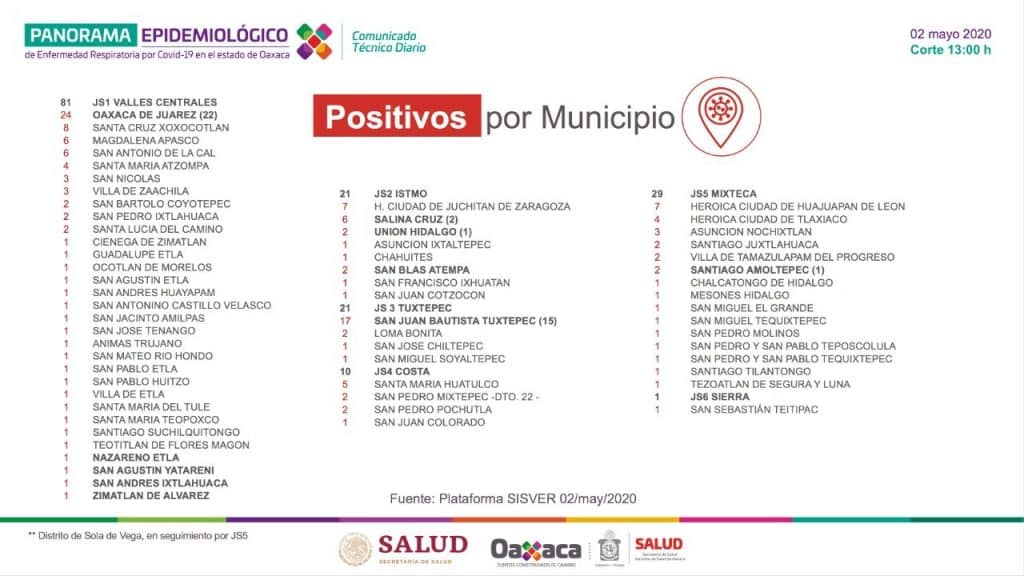Durante el corte diario del panorama epidemiológico del curso de la pandemia, el director de Atención Médica de los SSO, Erick Azamar Cruz, en representación del secretario de Salud, Donato Casas Escamilla, detalló que hasta este sábado 2 de mayo, se notificaron dos defunciones más a causa de esta patología vírica; las cuales ocurrieron en la zona de Valles Centrales y Tuxtepec; por lo que a la fecha se contabilizan 22 muertes a causa de este padecimiento.