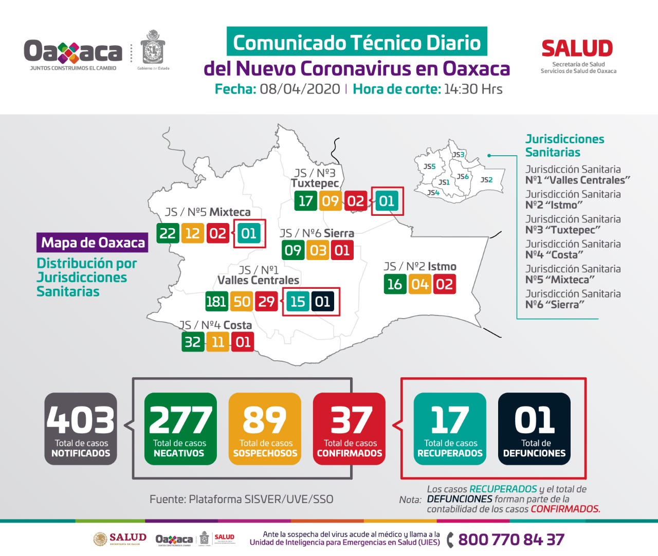 Oaxaca de Juárez, Oax. 8 de abril de 2020. El titular de los Servicios de Salud de Oaxaca (SSO), Donato Casas Escamilla, informó que al corte de este miércoles 8 de abril se han registrado 37 casos positivos de COVID-19, de estos, 17 pacientes están recuperados: 15 son de la Jurisdicción Sanitaria número uno Valles Centrales, uno de Tuxtepec y uno de la Mixteca.