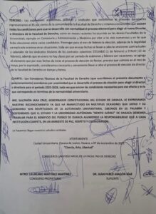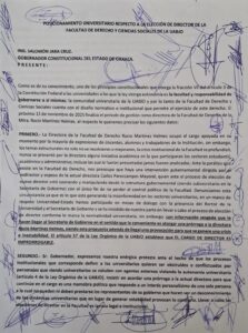 “Creemos en su palabra y sostenemos que el Estado y la Universidad deben trabajar por el bien de Oaxaca, en un ambiente de paz, respeto y colaboración”, concluye la carta firmada por docentes, alumnos y representantes sindicales de la Facultad de Derecho y Ciencias Sociales.
