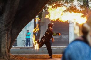 El estruendo de un petardo le revienta el tímpano izquierdo a una mujer policía con más de 20 años en la corporación, su cuerpo es abrumado por el calor del fuego provocado por una bomba molotov que cayó a su costado, la lumbre, su uniforme y equipo de protección convierten su cuerpo en un pequeño infierno portátil.
